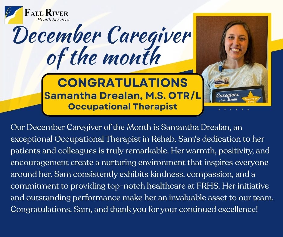 Congratulations to Sam Drealan, the outstanding Occupational Therapist in Rehab who has been named December's Caregiver of the Month! Her dedication and professionalism in promoting health and wellness are truly commendable.